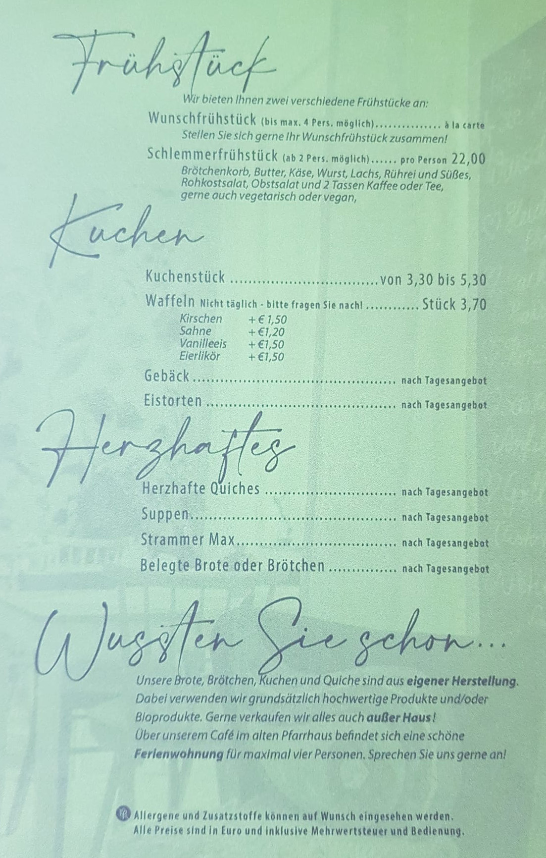 In unserem Café bekommen Sie Frühstück mit selbstgebackenen Brötchen, Brot und Stuten. Gerne auch hausgemachte würzige Quiches und natürlich auch Gebäck, Kuchen und Torten aus dem eigenen Ofen.